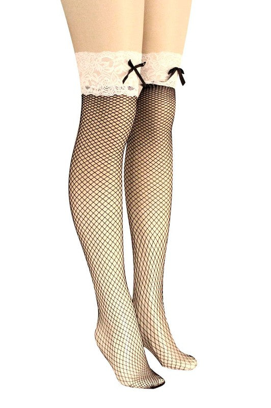 White Top Ribbon Knee High Fish Net Black Stocking